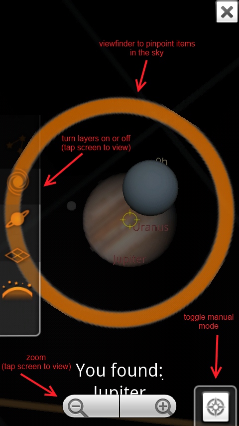 Curious as to what stars are directly above you? Just point your phone towards the sky and voila! The app tells you. Feel dizzy as the stars whirl around your screen? Switch from automatic to manual mode and better control the view. A great zoom feature enabled me to enlarge Jupiter to about the size of a quarter on the my homescreen. Sure enough there it was in all its beige, brown and orange-striped glory. Wild.