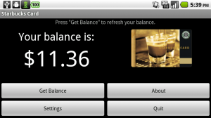 The goal of the app is simple: with the push of a button, obtain the current balance of your Starbucks card. That’s it – no flashes, bangs, or flying sparklers coming out of your Android phone. For most of you, this probably sounds rather pointless. If you are a Starbucks fiend like me or you stick to a weekly coffee budget and you like to keep tabs on yourself, then seeing the dollars and cents listed on the screen will bring you a lot of joy.