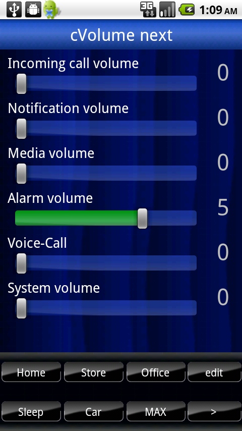 Of course, I could manually set these volume levels using Audio Manager, but the cVolume Next widgets are little buttons that offer one-click sound profile changing, so when I go to bed, I just click the “Sleep” button in the widget on my homescreen and I know all sounds are off but my alarm is still audible.