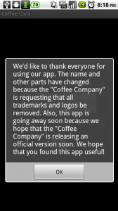 Other apps that covered a similar niche (the Starbucks Gift Card system) appear to have received similar instruction. For example, the new “My Coffee Card” (formerly the Starbucks Card Widget) has placed the news of a C&D from Starbucks directly on their “What’s New” page, stating that they were also required to rename their app available through the Android Market as well as change the icon. My Coffee Card is a much more in-depth app, with a system built in to reload the gift card similar to the Starbucks website. My Coffee Card has also kept the paid version of their app available.